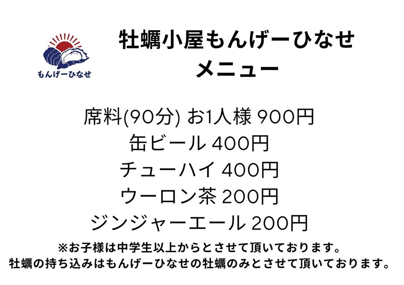 ※下記は牡蠣小屋もんげーにひなせのメニューになります。